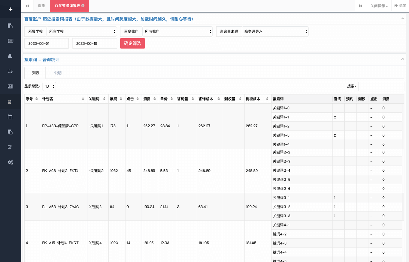 一鍵生成賬戶投放關鍵詞的咨詢、到校成本!