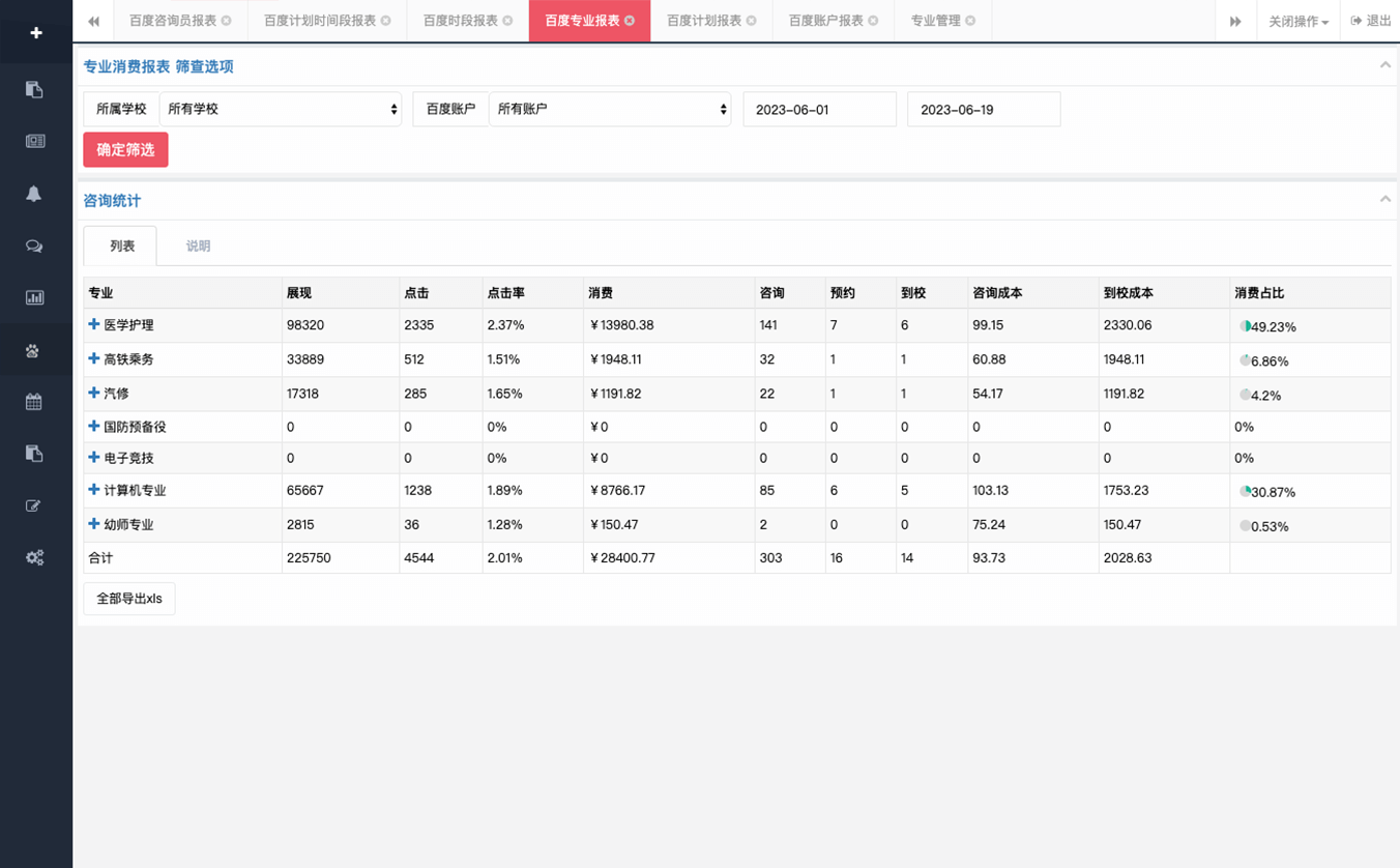 CRM系統通過聚合百度競價接口投放數據,從學生咨詢至到校過程提高咨詢人員效率和客戶信息利用率,可有效控制成本、提高營銷精準度幫您提升學校業績…
