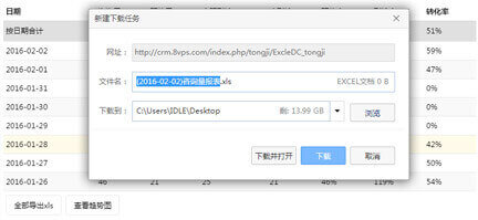 聚合百度、商務通數據,提供多種自定義生成數據報表、咨詢員報表、專業報表、推廣渠道報表、咨詢方式報表、關鍵詞報表;同時報表都可生成柱狀圖或折線圖,并且可以下載EXCLE表格。